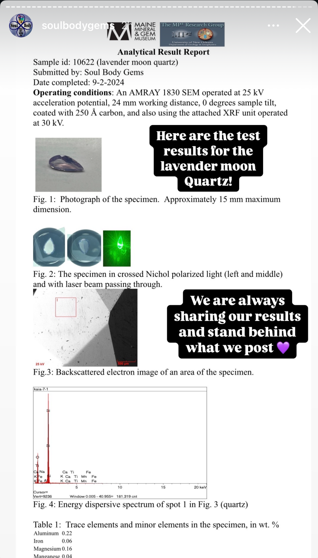 I do want to note though that these findings are not conclusive evidence that the lavender quartz tested is natural. As I explained earlier, the source material may been natural but these tests do not provide a conclusion that its untreated. The report is largely factual, however, it does not mention any specific testing for heat or irradiation treatments. It only describes the specimen’s physical characteristics (such as inclusions and trace element composition) and speculation about possible natural factors affecting its colour, like natural radiation exposure.